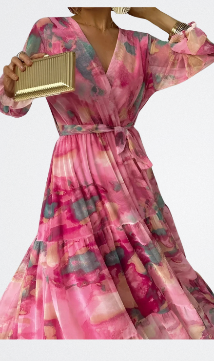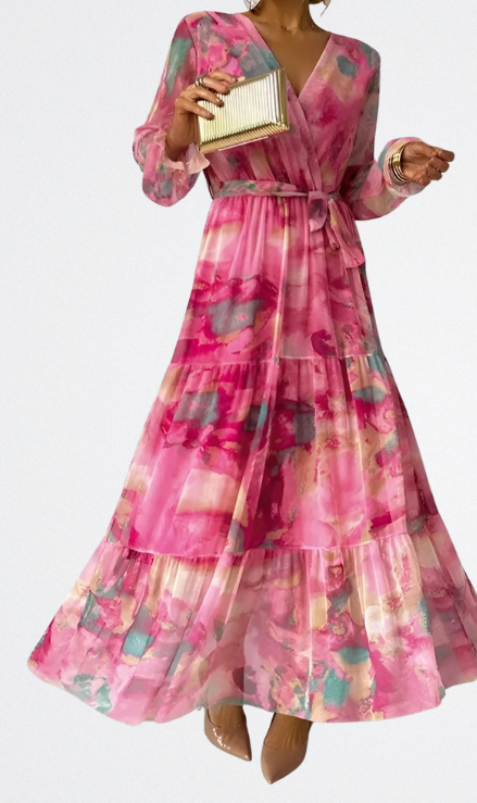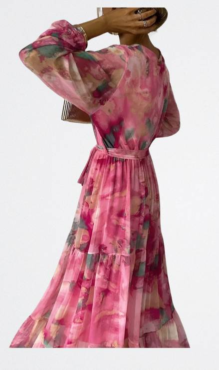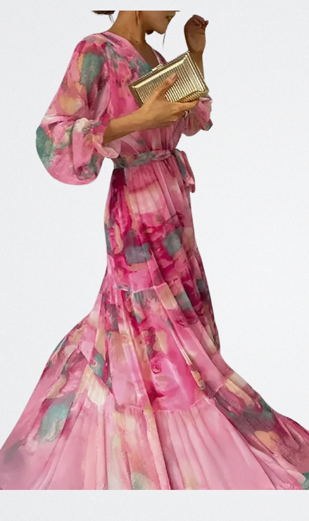 Abito lungo con maniche trasparenti e scollo a V incrociato, aderente in vita con un delicato fiocco che esalta la silhouette. La stampa floreale in tonalità rosate e tocchi acquerellati trasmette freschezza e femminilità, mentre gli strati vaporosi creano un movimento etereo ad ogni passo. Ideale per eventi diurni, celebrazioni all'aperto o serate estive incantevoli.
