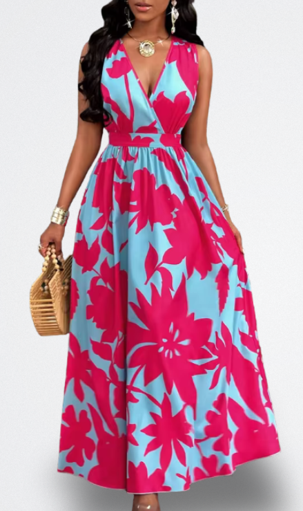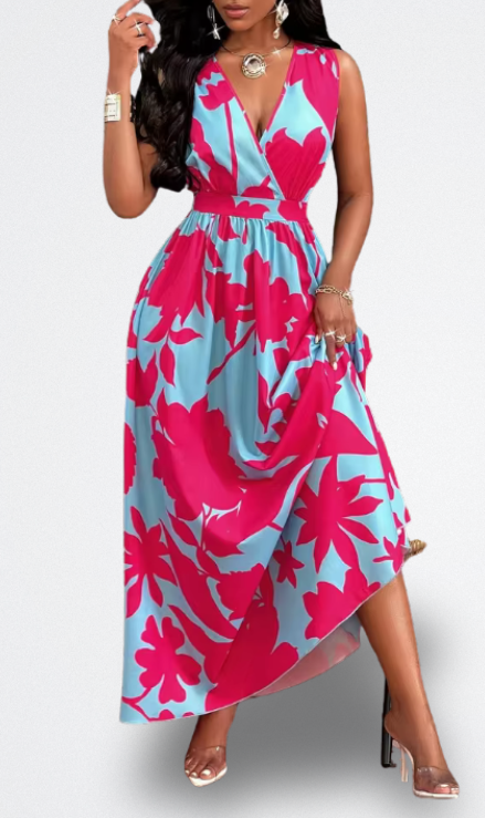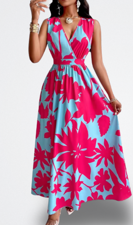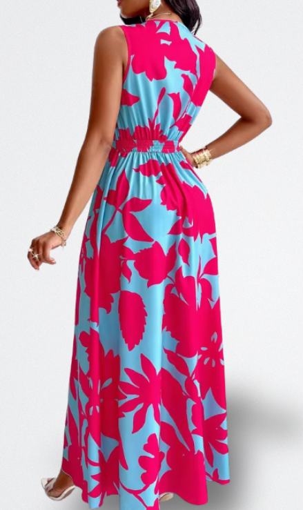 Fai sì che il tuo arrivo si senta come una destinazione. Questo vestito lungo con stampa tropicale ti avvolge in una fiducia vibrante — quella che trasforma un brunch in giardino nella tua passerella personale. Con una scollatura pronunciata e una vita che si adatta come un guanto, emana un'eleganza disinvolta mentre cattura ogni brezza calda. Dove splende il sole, tu brilli.