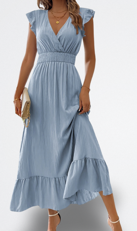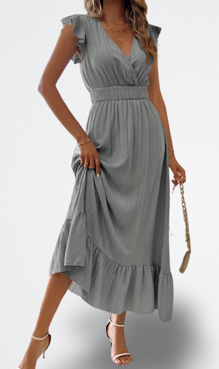 Il Vestito Incrociato Grigio Spaziale con Volant è il tuo alleato ideale per un brunch in giardino, un pomeriggio caldo su una terrazza o quel fascino di “l’ho indossato senza pensarci” che conquista senza sforzo.