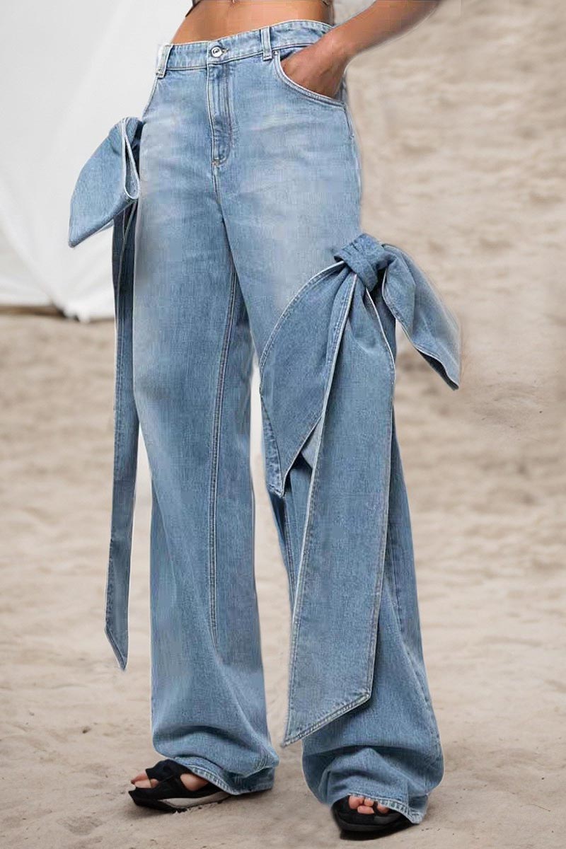 Questi pantaloni in denim con vita alta combinano il fascino vintage con un'estetica moderna. Con una finitura sbiadita, un design patchwork creativo e un accento a fiocco affascinante, danno un tocco fresco e alla moda al tuo guardaroba quotidiano. Il silhouette a gamba larga offre una vestibilità lusinghiera che allunga le gambe, rendendoli perfetti per ogni uscita informale.